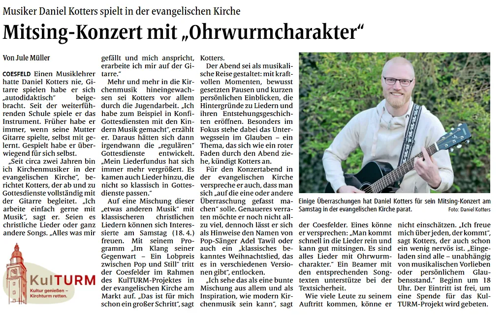 Im Rahmen unseres KulTURM-Projektes laden wir Sie herzlich zu einem besonderen Mitsing-Konzert mit Daniel Kotters mit neuen christlichen Songs ein.