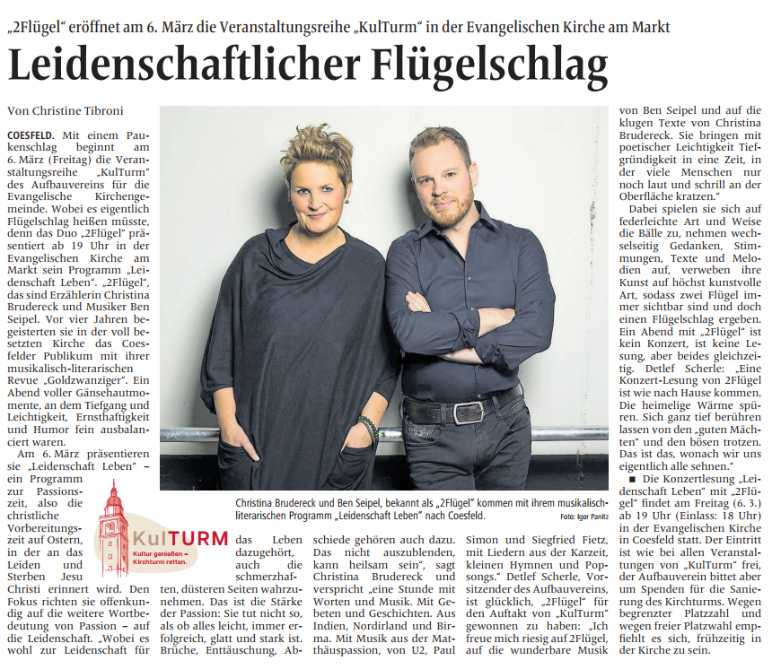 "2Flügel" eröffnet am 06. März die Veranstaltungsreihe "KulTURM" in der Evangelischen Kirche am Markt.