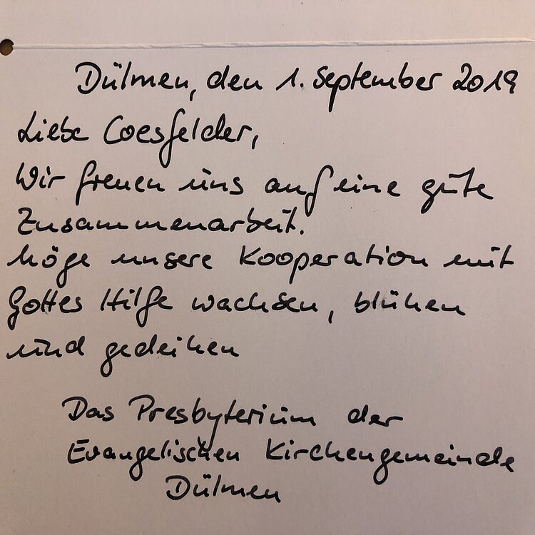 Das ist ein Novum im Evangelischen Kirchenkreis Steinfurt-Coesfeld-Borken, von dem Superintendent Joachim Annicker sicher ist, dass es Schule machen wird und meint damit die pfarramtliche Kooperation der evangelischen Gemeinden Coesfeld und Dülmen.