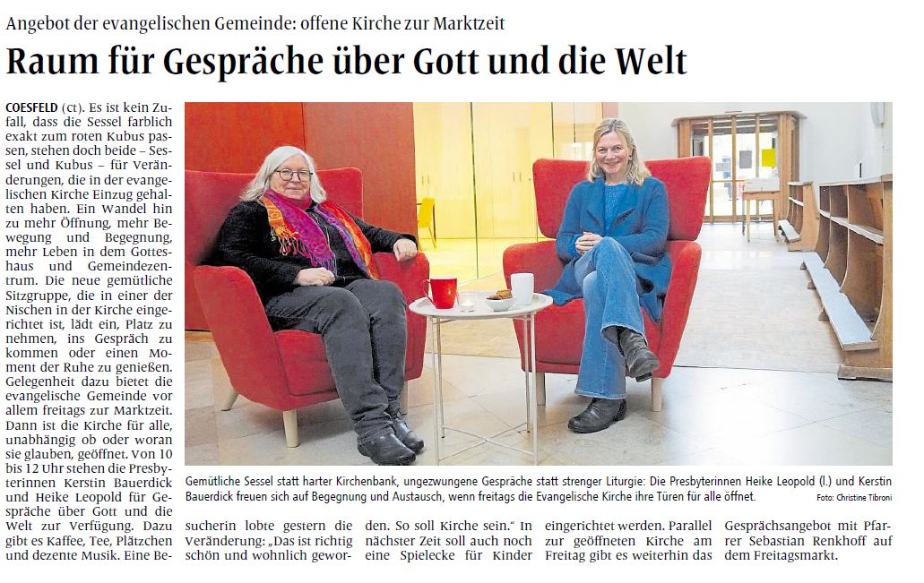 Jeden Freitag zur Marktzeit von 10:00 Uhr bis 12:00 Uhr begrüßen die Presbyterinnen Heike Leopold und Kerstin Bauerdick Besucher in unserer schönen Kirche. Gerne können Sie sich auch über die Veränderungen in der Kirche informieren.
